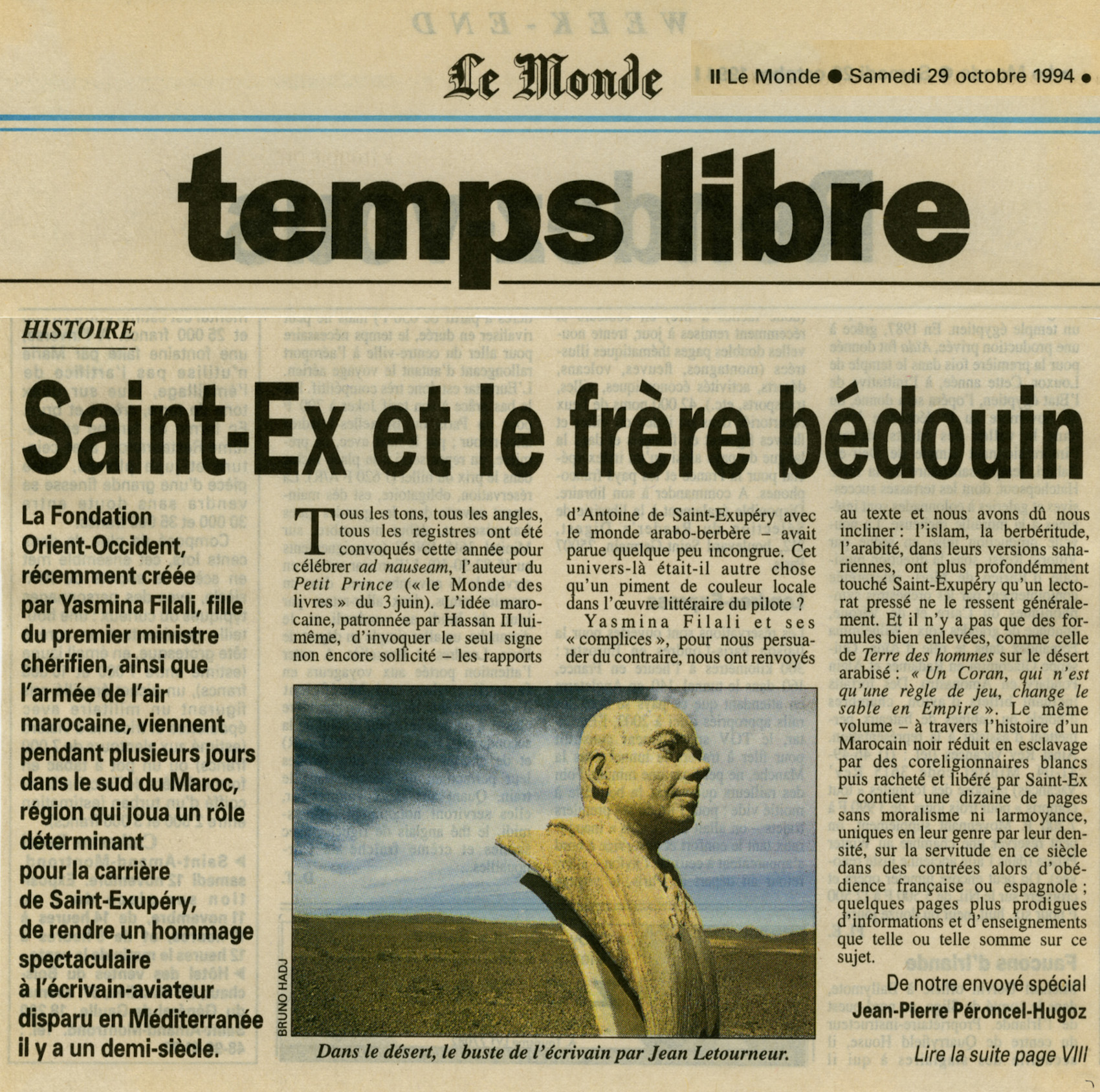 Ce Petit Prince que notre époque réduit à un aimable personnage de parc d’attractions, c’est St-Ex enfant revenu au seuil de sa mort — il savait très bien qu’il ne revendrait pas de l’une de ses missions de guerre — l’interroger sur le sens de sa vie. Il ne pouvait donc avoir d’autre visage que celui du pilote.