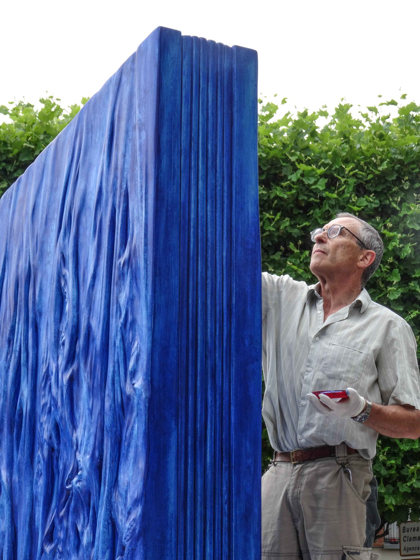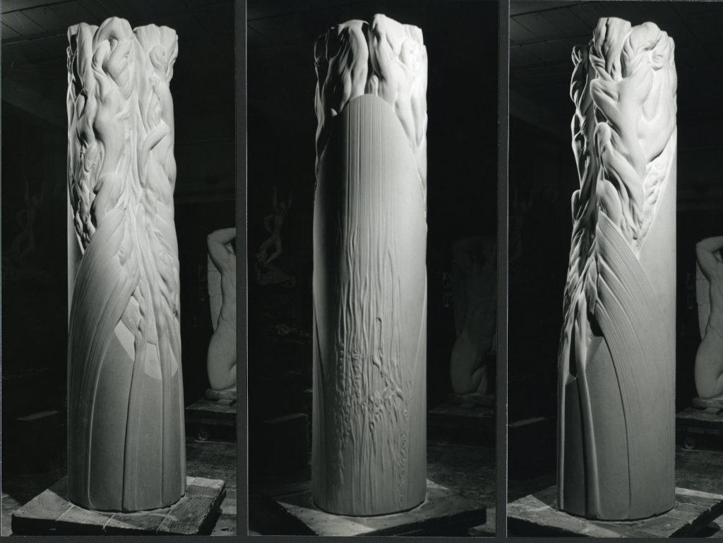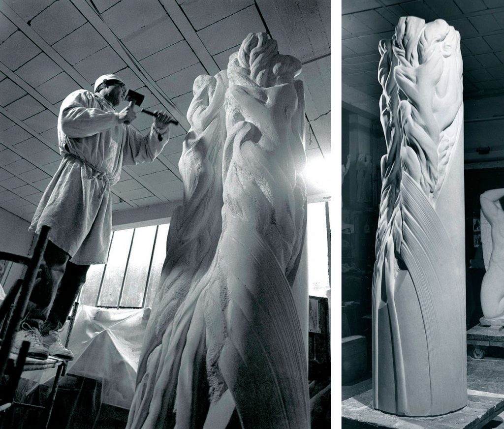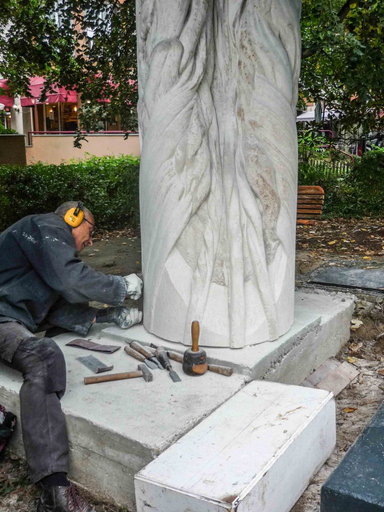 Dans sa position d’origine, l’enfoncement du cylindre dans le calepinage de la place exprimait sa translation verticale, jusqu’à la destruction de l’ensemble en 2017. Ne subsiste que la partie supérieure de la sculpture, épargnée par des nettoyages intempestifs au karcher, reprise en 2020 pour un nouvel emplacement.