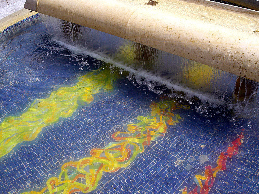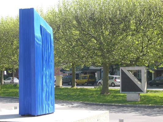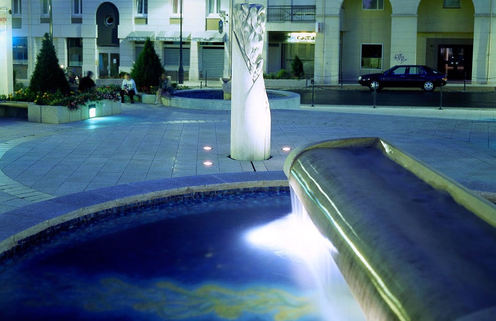 Commande de la ville de Fontenay-aux-Roses, qui fut pour moi l’occasion de relier mes centres d’intérêt aux contraintes d’un cadre architectural devant s’inscrire entre deux rangées de bacs à fleurs qui m’étaient imposées. Deux bassins sur un axe diagonal donnent un rythme horizontal, renforcé par des mosaïques dérivées des tourbillons marginaux d’une voilure tournante, devenue deux déversoirs de pierre laissant glisser une silencieuse lame d’eau. Ces bassins circulaires se présentent comme deux oculi ouvrant sur une gigantesque nappe souterraine virtuelle couvrant la totalité de la place.