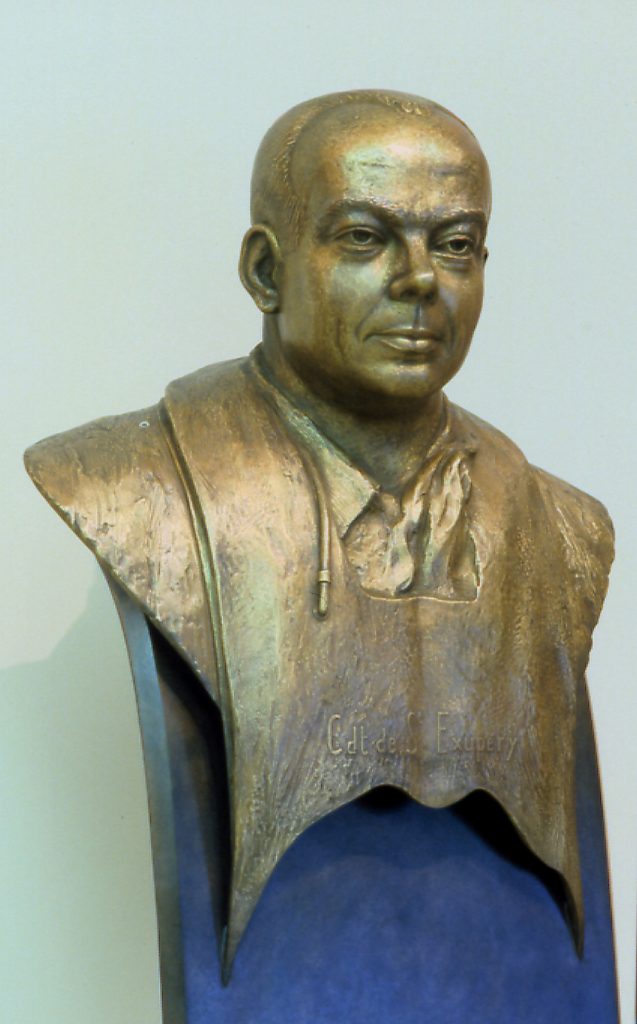 Issue de la médaille du cinquantenaire de sa disparition, cette stèle se présente comme un double portrait : celui du combattant de 1944 couronnant un profil d’aile d’avion bien sûr, mais aussi celui d’un Petit Prince sans visage, immatérielle silhouette inspirée de son dessin muni d’un grand manteau et dont l’épée effleure le sol.