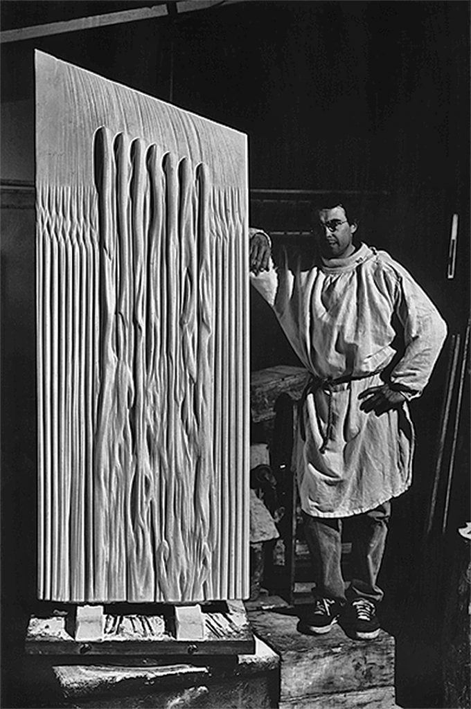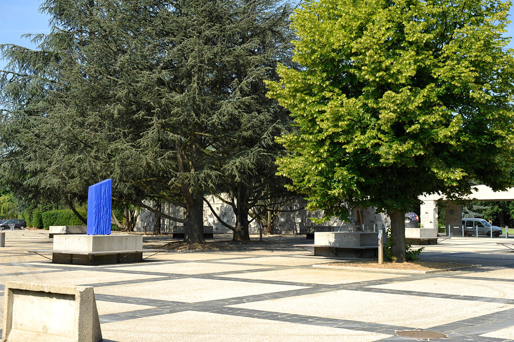 L’entrée du cimetière paysager de Clamart dessiné par Robert Auzelle fut achevée par Hugues Guilleminot, en prévoyant une série de socles pour des sculptures.