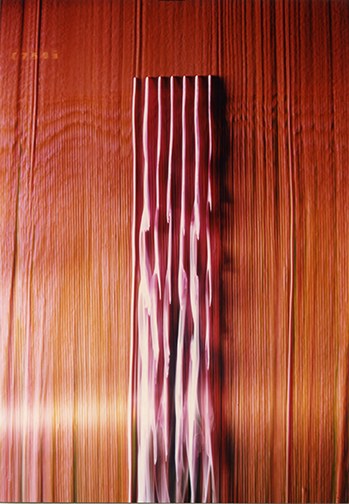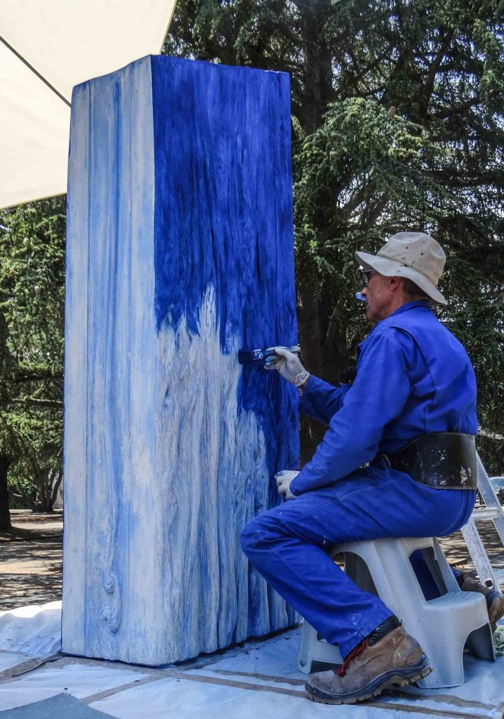 Repris sur trois passages ne se superposant pas mais d’un diamètre décroissant pour en suggérer la profondeur, le temps écoulé entre chaque cercle se traduit par un dégradé de couleurs. Dans l’axe de ce mouvement, comme sortant du sol par une découpe octogonale rappelant la section du prisme dont elle est issue, une pierre de trois mètres de hauteur prend la forme d’une colonne ascendante de fumée.